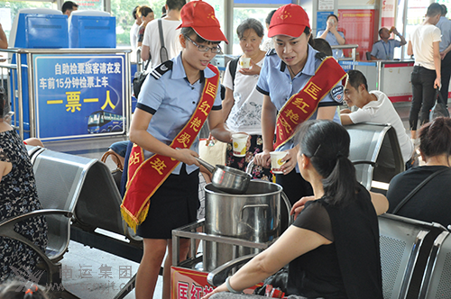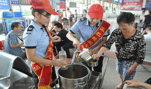 盛夏時節(jié),恰值每年暑運(yùn)高峰,在南充汽車客運(yùn)站內(nèi),數(shù)千旅客川流不息,奔波于各自的行程中。為做好旅客乘候車過程中站務(wù)服務(wù)工作,南充汽車客運(yùn)站組織“匡紅艷愛心班”自愿者服務(wù)隊員,利用業(yè)余時間熬煮綠豆南瓜湯,堅持每天送到候車大廳、售票大廳,送到每一位需要的旅客手中。她們用愛心為候車的旅客送上了一絲絲清涼,一些旅客見此情景深受感動,一位趕乘蓬溪班車的旅客在連續(xù)喝了三杯后感慨地說到“沒想到你們做得這么好,在其他地方我真還沒有見到過”。并問道“你們是每天都送綠豆湯嗎”?愛心班的姐妹們回答到:“在夏日伏天中我們每天都要給旅客送到現(xiàn)場,歡迎你下次來站飲用”。這位旅客連聲稱贊地說“謝謝你們,有時間我一定在網(wǎng)上宣傳你們”!安挥茫灰銈儩M意就是對我們最好的肯定”。為旅客在候車的時候解除暑熱,帶來涼意,是愛心班姐妹們的心愿。當(dāng)志愿者們看到旅客喝著綠豆湯,倦意漸消的情景,她們倍感欣慰。她們知道在這“火熱”的盛夏里,送綠豆湯的小小舉動,溫暖了旅客們的心。 (張蜀慧 王洪)