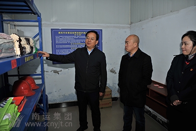 省總工會黨組成員、經(jīng)費審查委員會主任張開鋒(左一),市總工會黨組成員、副主席屠繼東(左二),在南充汽車客運站勞保庫房查看職工勞動保護(hù)用品庫存情況。