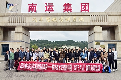 參加四川省2025年教師培訓項目——數(shù)字技術(shù)支持的科創(chuàng)(STEAM)教育專項培訓的教師合影留念。