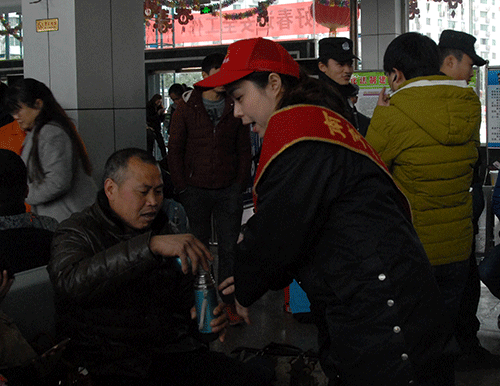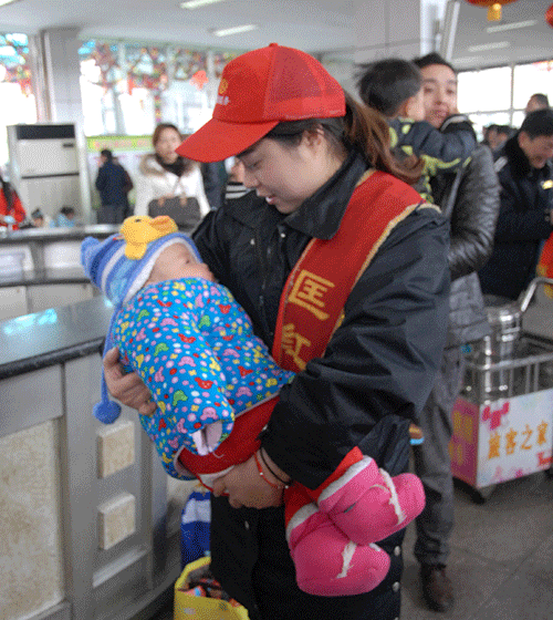 頭戴“小紅帽”的“匡紅艷愛(ài)心班”的站務(wù)人員,身佩大紅授帶,不斷地穿行在售票廳、候車(chē)廳。有為購(gòu)票旅客解答疑難的導(dǎo)乘人員,有在咨詢處為旅客不厭其煩耐心解答的咨詢?nèi)藛T,有在車(chē)站候車(chē)廳為旅客送鮮開(kāi)水的服務(wù)人員,還有嘉陵區(qū)團(tuán)委安排的4名青年志愿者,他們滿腔熱情地扶老攜幼,在行包安檢后幫提行李,讓旅客順利的登上返程班車(chē)。一位獨(dú)自一人去墊江的女乘客放心的將自己不到一歲的小寶寶遞交給“小紅帽”站務(wù)人員抱著,以便自己入廁,當(dāng)又抱回自己的小寶寶后,非常感謝“小紅帽”的幫助。