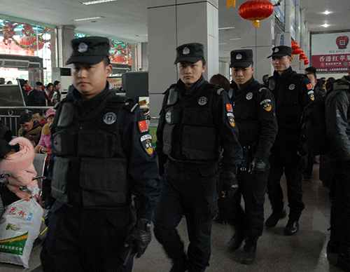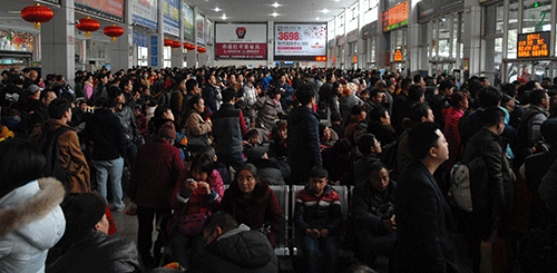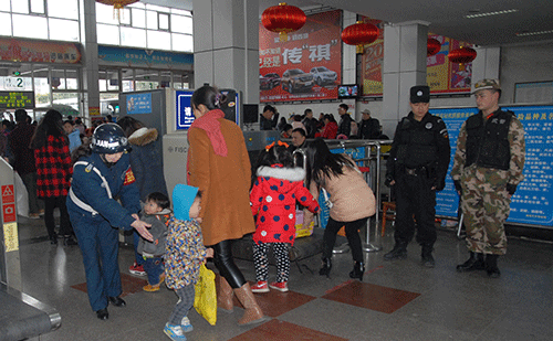 中午1點(diǎn)多鐘,由于成南高速公路私家小車(chē)流量增大,嚴(yán)重堵車(chē),造成加班車(chē)輛不能及時(shí)返回車(chē)站,致使到成都的旅客排著兩列隊(duì)伍從候車(chē)廳8號(hào)檢票口一直延伸到5號(hào)檢票口對(duì)面的候車(chē)廳內(nèi)。但一直沒(méi)有看見(jiàn)到成都排隊(duì)上車(chē)的隊(duì)伍延伸到候車(chē)廳外,象往年那樣在站前廣場(chǎng)蜿蜒曲折“山路十八彎”的情景了。懸掛著12個(gè)大紅燈籠的整個(gè)候車(chē)大廳里旅客十分擁擠,人滿為患,卻暖意融融。車(chē)站派出所所長(zhǎng)楊宗明帶領(lǐng)6名公安干警和嘉陵區(qū)公安分局的8名特警來(lái)回巡邏執(zhí)勤,反恐防暴,高度警惕地維護(hù)著檢票上車(chē)和旅客候車(chē)秩序。