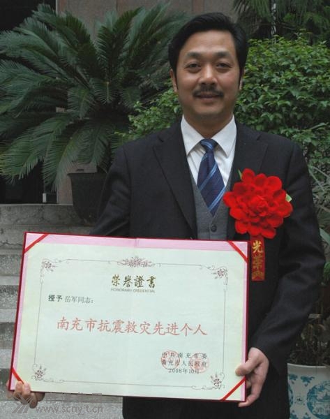 圖為藍(lán)光公司經(jīng)理岳軍被市委、市政府授予“南充市抗震救災(zāi)先進(jìn)個(gè)人”稱號(hào)