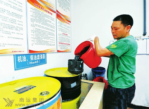 南充精誠(chéng)汽車維修分公司修理技工將廢棄油(液)集中收集起來(lái)