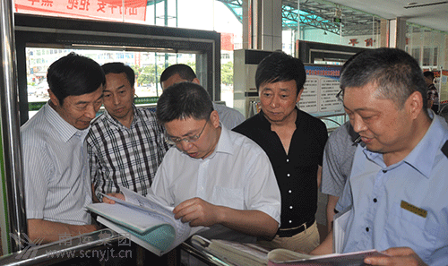 省運管局局長王波(左三)在南充汽車客運站檢查汛期安全工作 省運管局局長王波在南充汽車客運站查閱旅客行包安檢資料
