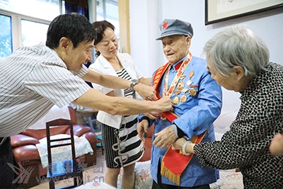 市委組織部副部長、老干部局局長劉彬看望慰問南運集團104歲高齡老紅軍曹守成 為曹老紅軍佩戴“中共中央 國務(wù)院 中央軍委 慶祝中華人民共和國成立70周年”紀念章