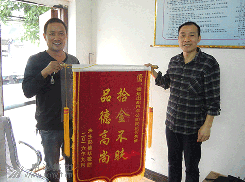 蓬安德運(yùn)出租汽車公司經(jīng)理張洪濤(右)接過失主送來的錦旗