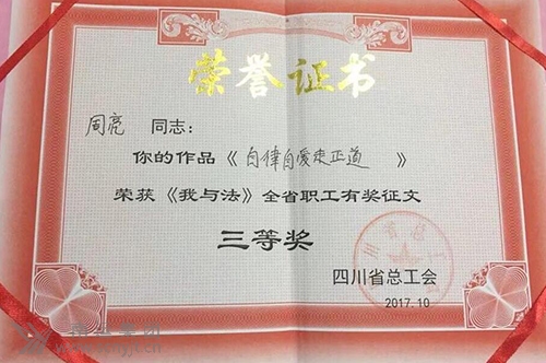 為進一步增強廣大職工依法維護自身合法權(quán)益的知識和意識,推動形成全民學法、尊法、信法、守法、用法的良好環(huán)境,2017年10月四川省總工會舉辦了“我與法——全省職工有獎征文”活動。南運集團旅游分公司工會干事周亮,創(chuàng)作的《自律自愛走正道》一文榮獲“《我與法》全省職工有獎征文”三等獎。