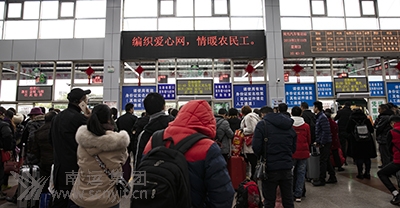 候車大廳里返鄉(xiāng)返崗農(nóng)民工依次進(jìn)站乘車