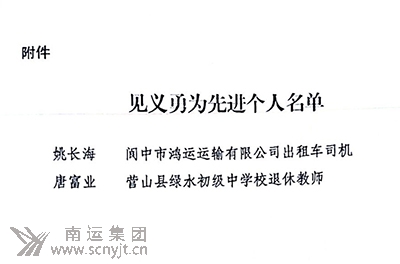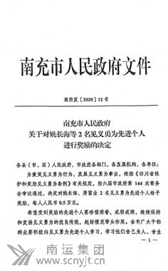 2020年12月底,經(jīng)六屆南充市人民政府第144次常務(wù)會議審議通過,決定對姚長海、唐富業(yè)2名見義勇為先進(jìn)個(gè)人進(jìn)行獎(jiǎng)勵(lì),每人0.5萬元人民幣,并下發(fā)《關(guān)于對姚長海等2名見義勇為先進(jìn)個(gè)人進(jìn)行獎(jiǎng)勵(lì)的決定》(南府發(fā)〔2020〕12號)。 姚長海52歲,蓬安人,現(xiàn)為南運(yùn)集團(tuán)閬中鴻運(yùn)運(yùn)輸有限公司里一名出租車駕駛員。2018年11月26日上午,姚長海在搭乘一名女孩時(shí),發(fā)現(xiàn)該女孩滿面淚痕,于是他在途中勸導(dǎo)女孩,可對方并不回應(yīng),女孩下車時(shí)將車費(fèi)交到姚長海手中便迅速離去。姚長海感覺情況異常,于是將車停在路邊,下車尋找女孩。在尋至嘉陵江邊時(shí),姚長海發(fā)現(xiàn)女孩已經(jīng)跳江,于是他奮不顧身躍入冰冷的江水中奮力施救,最終在岸上群眾的幫助下把輕生女孩救上岸,讓正處花季的生命得以延續(xù)。 姚長海不但多次見義勇為,他在平時(shí)的營運(yùn)過程中也始終堅(jiān)持做到扶老攜幼、熱情服務(wù)、文明待客,從不欺客宰客、從不拒載;凡拾到乘客遺失的物品,他都立即聯(lián)系失主或上交公司;每年高考,他都積極參加公司組織的免費(fèi)送考服務(wù);在同事遇到困難時(shí),他都會出手幫一把。他總是說:“誰沒有困難的時(shí)候,自己能幫一把就幫一把”。 姚長海在寒冷的嘉陵江中將17歲輕生女孩救上岸的英勇壯舉在《中央電視臺》《人民日報(bào)》《新華社》《新京報(bào)》《四川日報(bào)》等全國300多家新聞媒體和網(wǎng)絡(luò)平臺廣為報(bào)道,在全中國產(chǎn)生了廣泛的影響;他見義勇為和平時(shí)拾金不昧及助人為樂的先進(jìn)事跡感動了社會,獲得了應(yīng)有的榮譽(yù)和獎(jiǎng)勵(lì)。他曾入選“2018年感動南充十大新聞人物”,先后被評為“閬中好人”、“最帥的哥”,并獲得阿里巴巴“2018年度正能量人物”和獎(jiǎng)金1萬元;2019年他被評為“四川好人”,2020年獲得南充市政府的表彰和獎(jiǎng)勵(lì)。 姚長海作為南運(yùn)集團(tuán)出租車駕駛員,為南充出租行業(yè)爭了光,為社會、也為出租車駕駛員及公司員工樹立了良好的榜樣。希望廣大員工向姚長海同志學(xué)習(xí),做一個(gè)樂于助人、道德高尚、受人尊敬的人,為提升企業(yè)形象、建設(shè)平安南充作出新的更大貢獻(xiàn)。 附:南充市人民政府《關(guān)于對姚長海等2名見義勇為先進(jìn)個(gè)人進(jìn)行獎(jiǎng)勵(lì)的決定》(南府發(fā)〔2020〕12號)