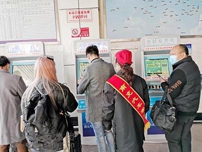 站務(wù)人員引導(dǎo)旅客在售取票機(jī)上購取車票