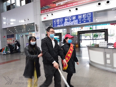 11月13日,寒風(fēng)陣陣,天空下著小雨,明顯比前幾天冷了許多。八點(diǎn)十分左右,兩位旅客站立在南充汽車客運(yùn)站售票廳門口,神態(tài)異常、焦急萬分,該站愛心班站務(wù)人員強(qiáng)燕和鄧雙發(fā)現(xiàn)后立即上前詢問,通過面對面觀察交流,得知兩位旅客都是盲人,他們乘坐出租車來到車站,準(zhǔn)備坐9;30前往隆昌的班車。由于出租車司機(jī)把他們送到站前廣場就離開了,一時之間,他們不知道該往哪里去。身邊又無人陪同,強(qiáng)燕和鄧雙了解情況后,立即開展幫扶行動,一個攙扶兩位盲人旅客,一個用愛心推車將他們的行李搬到推車上,通過安檢直接推送到候車室暫時休息。 九點(diǎn)十分,兩位站務(wù)人員提前通過綠色通道,將兩位盲人旅客送進(jìn)站臺攙扶上車,裝好行李。并告訴駕駛員這兩位旅客的情況,再三叮囑一定要把這兩位盲人旅客送到接站的家人手里。 愛心班站務(wù)人員細(xì)心周到的服務(wù),讓這兩位盲人旅客感激不已,坐上車后,他們緊握著愛心班工作人員的手說道:“謝謝,謝謝你們了!”“不用謝,這是我們應(yīng)該做的!睆(qiáng)燕和鄧雙異口同聲的回答道。目送著班車的發(fā)出,她們又立即返回到自己的工作崗位上,準(zhǔn)備為下一位旅客服務(wù)。 真誠做人、平凡善舉、用心做事,踐行服務(wù)至上的理念,用愛溫暖旅客回家路,是該站愛心班每位成員的優(yōu)良傳統(tǒng)。 (李利 陳春華)