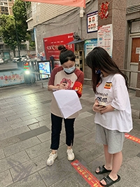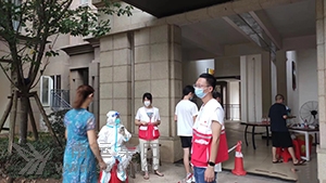 旅游分公司黨員張菁(右一)參加社區(qū)抗疫維護秩序。