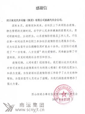 鄧迪還自費為社區(qū)各值守點位捐贈飲用礦泉水十余件,極大的彰顯了南運集團共產(chǎn)黨員在關(guān)鍵時刻、危難時刻奉獻社會的先鋒模范作用,社區(qū)大媽們翹起大拇指說:“你們南運人真棒!”8月27日,順慶區(qū)西山街道辦事處伍家埡社區(qū)居民委員會還給南運集團旅游分公司寄來了情真意切的《感謝信》。