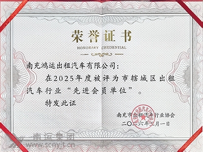 南充鴻運(yùn)出租汽車有限公司榮獲 2025年度市轄城區(qū)出租汽車行業(yè)“先進(jìn)會(huì)員單位”稱號(hào)