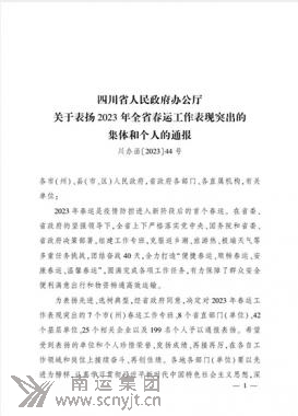 南運(yùn)集團(tuán)被四川省人民政府表彰為 “2023年全省春運(yùn)工作表現(xiàn)突出的集體”