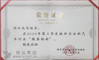 南運鴻運的哥張紅兵榮獲2025年南充市出租汽車行業(yè) 第二季度“服務(wù)標(biāo)兵”稱號